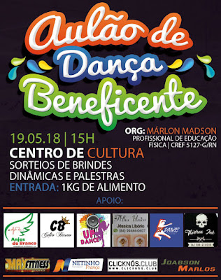 No próximo sábado (19), será realizado em Macaíba o 1º Aulão de Dança Beneficente, o evento terá início a partir das 15h no Centro de Cultura, sendo finalizado as 17h. A entrada é 1k de Alimento não perecível.