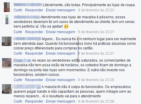 Nesta última quinta-feira (09) publicamos em nossa página no Facebook que algumas lojas de Macaíba precisam melhorar o atendimento aos clientes. O post que não tinha objetivo de saber a opinião dos internautas acabou atraindo mais de trinta e cinco pessoas a comentar sobre o assunto, onde na grande maioria deles criticaram e concordaram que existe sim um mal atendimento em algumas  lojas do comércio local.