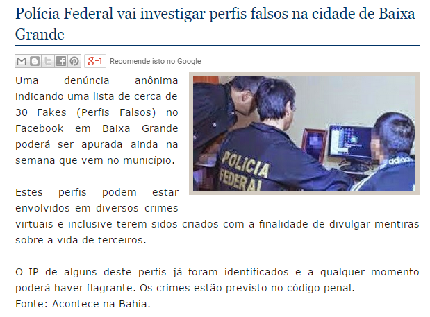 Na cidade de Baixa Grande a Polícia Federal foi quem teve que ser acionada após perfis fakes serem usados para espalhar mentiras. Quem pensa que a polícia não tem ferramentas para identificar a localização dos computadores está enganado, a primeira ação da polícia foi descobri o IP, após isso planejar o flagrante.