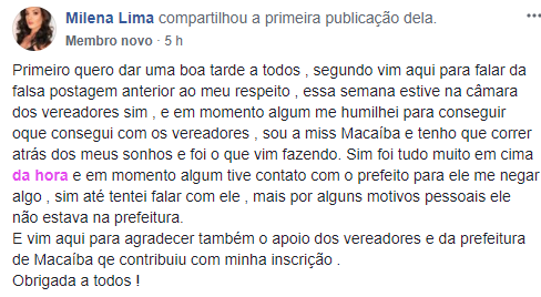 A Miss Macaíba 2018, Milena Lima, utilizou seu perfil no Facebook para desmentir postagem citando seu nome. A Miss que esteve na última terça-feira (03) na Câmara Municipal de Macaíba para solicitar aos vereadores um apoio para uma inscrição, acabou tendo seu nome citado em uma postagem no grupo Macaíba, onde um cidadão postou que Milena estava se humilhando para conseguir a contribuição para inscrição.