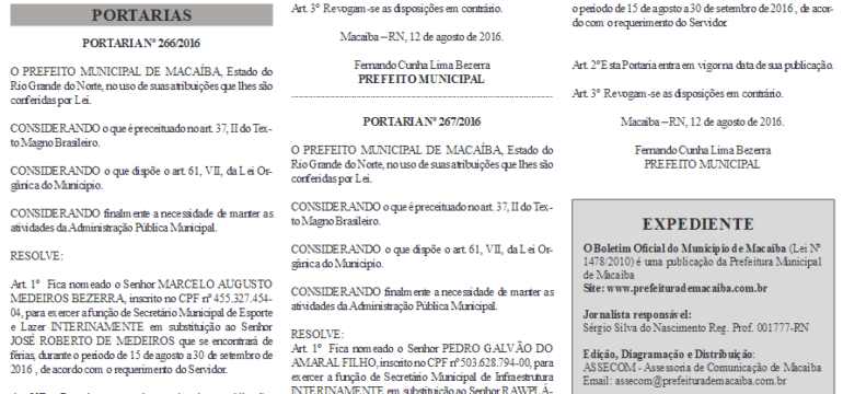O Secretário Municipal de infraestrutura, Rawplácido Maia vai tirar férias do dia 15 deste mês até o dia 30 de setembro, sendo substituido por Pedro Galvão neste período. Assim como Rawplácido, o Secretário de Esporte e lazer, Roberto Medeiros, também vai tirar férias a partir do dia 15 deste mês até dia 30 de setembro, sendo substituido por Marcelo Augusto neste período.