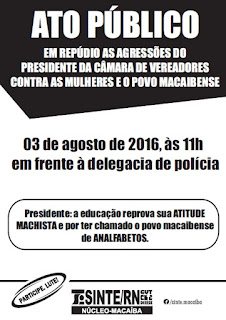 Circula nos veículos de comunicação de Macaíba, vários panfletos onde um deles afirma que o Sinte Núcleo Macaíba fará um ato público em repúdio ao Presidente da Câmara Municipal, Gelsom Lima. O ato segundo os panfletos, será realizado dia 03 de agosto, em frente da delegacia de Polícia Civil, a partir das 11hs.