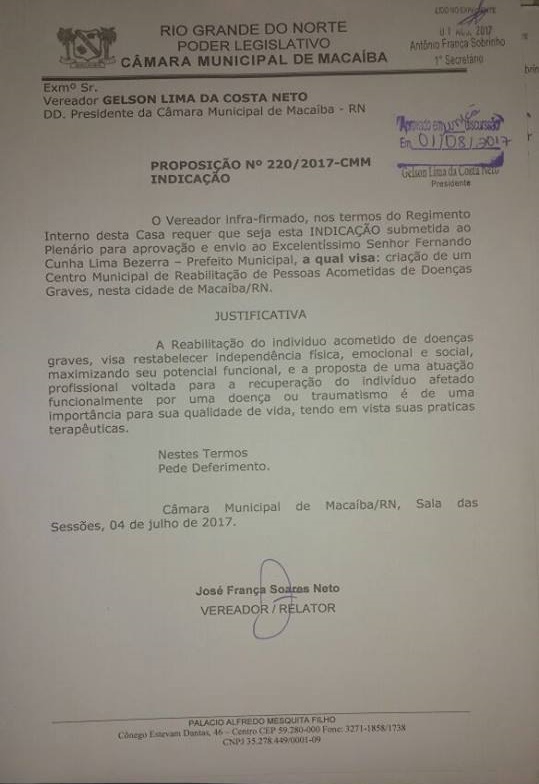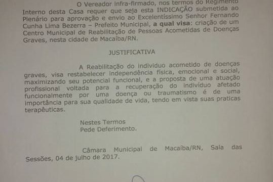 Na sessão passada o vereador Netinho França (SD) requereu um Centro Municipal para Reabilitação de Pessoas acometidas de doenças graves. Segundo Netinho, muitos procedimentos de reabilitação são feitos na cidade de Natal, e com um centro em Macaíba iria ajudar muitos macaibenses, pois existe um custo alto devido a locomoção para a cidade de Natal, além de ajudar aqueles que não tem condições de pagar transporte, principalmente os mais carentes.